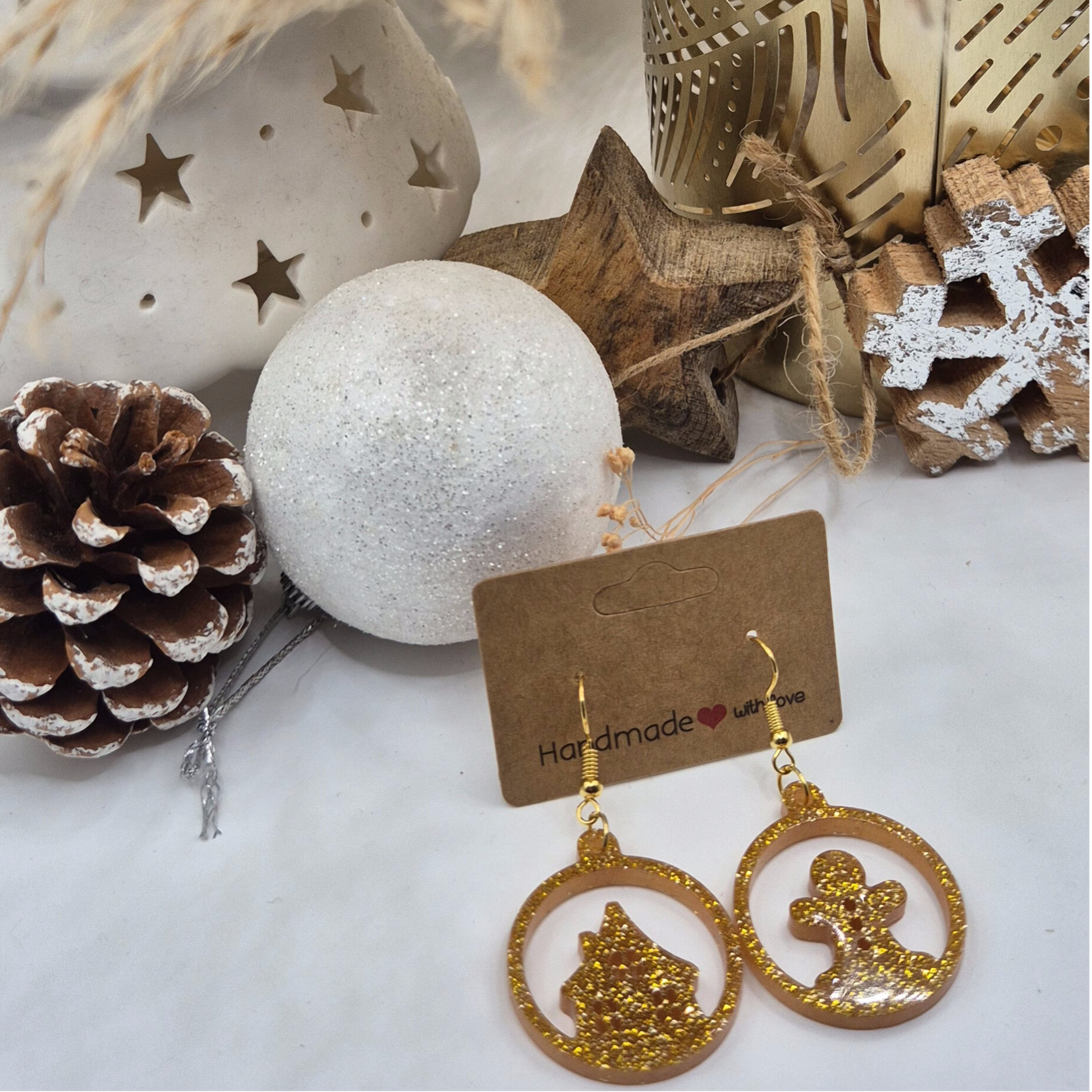Jolie paire de boucles aux couleurs scintillantes de Noël avec le joli petit Pain d'épice et sa maison assortie. Donneront une touche rigolote et élégante à votre tenue de fête !!