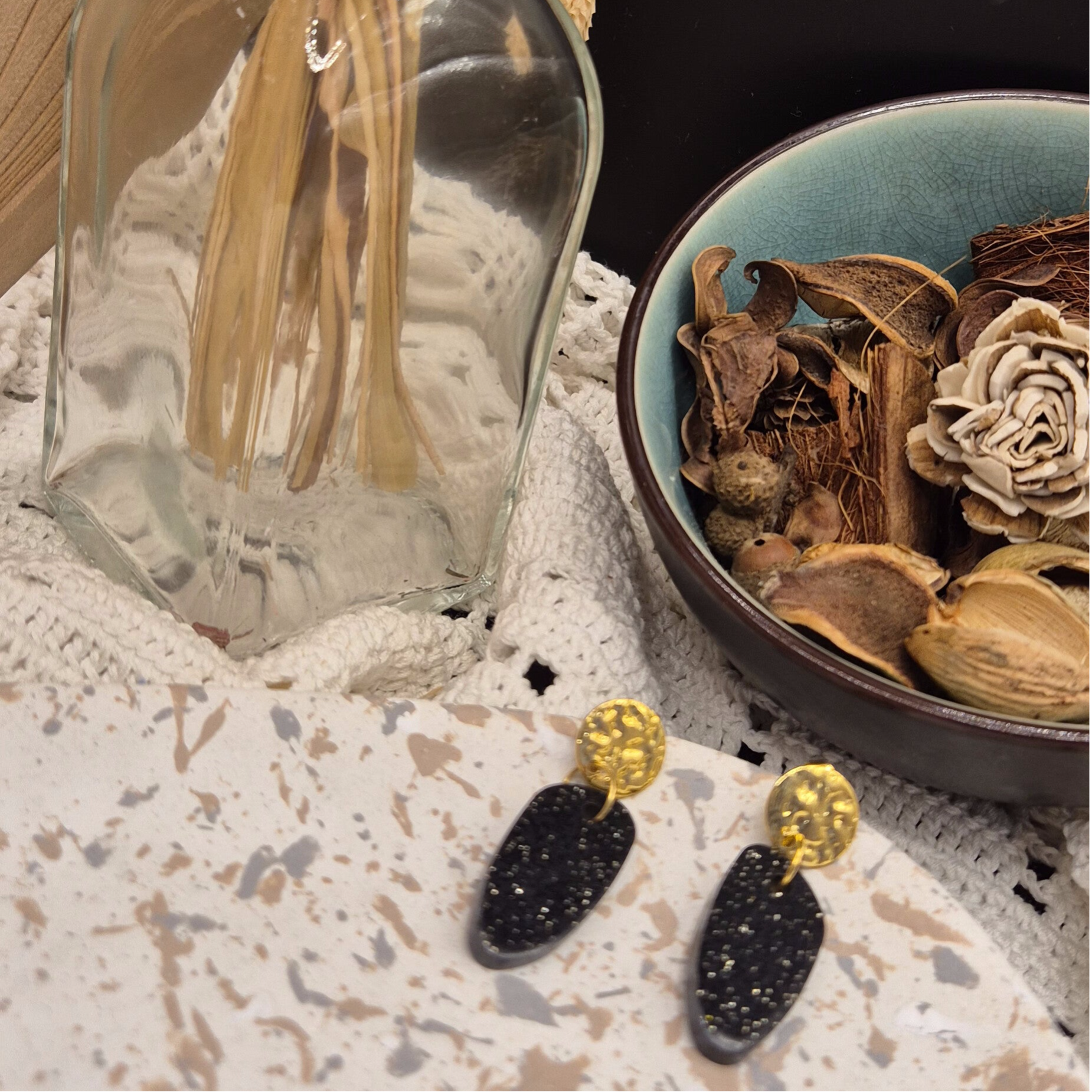 Elégantes paire de petites boucles Noires Scintillantes montées sur un clou martelé doré